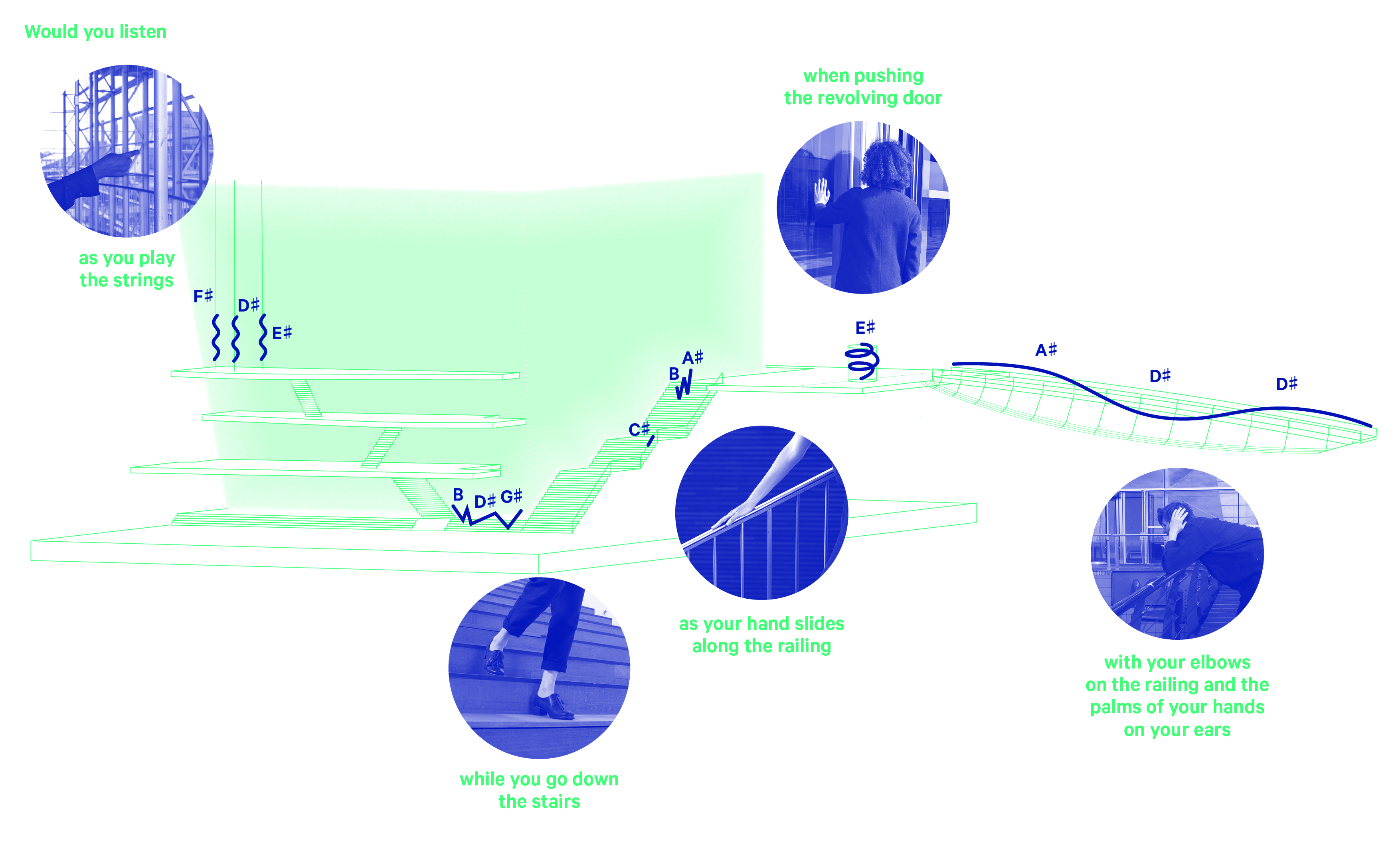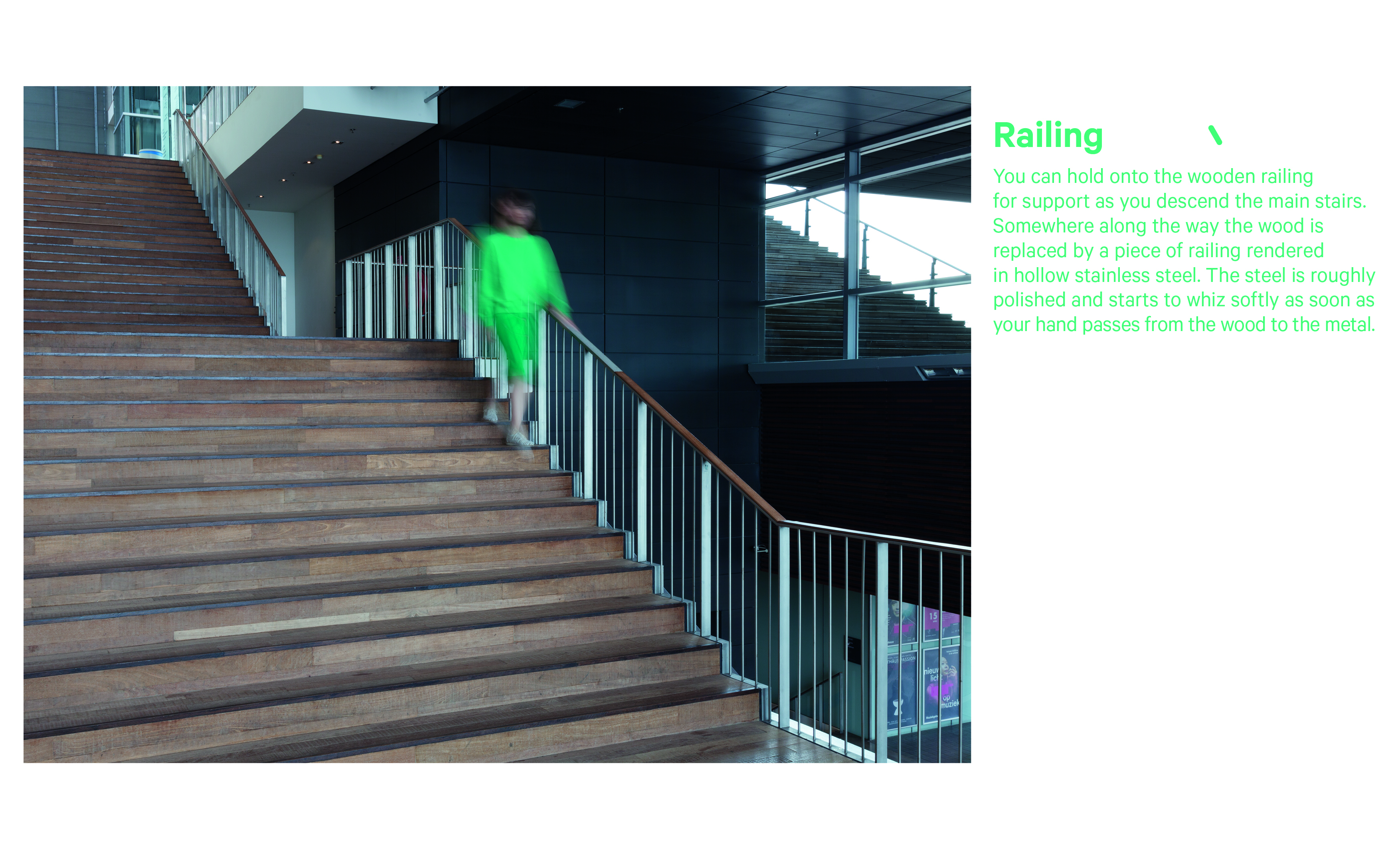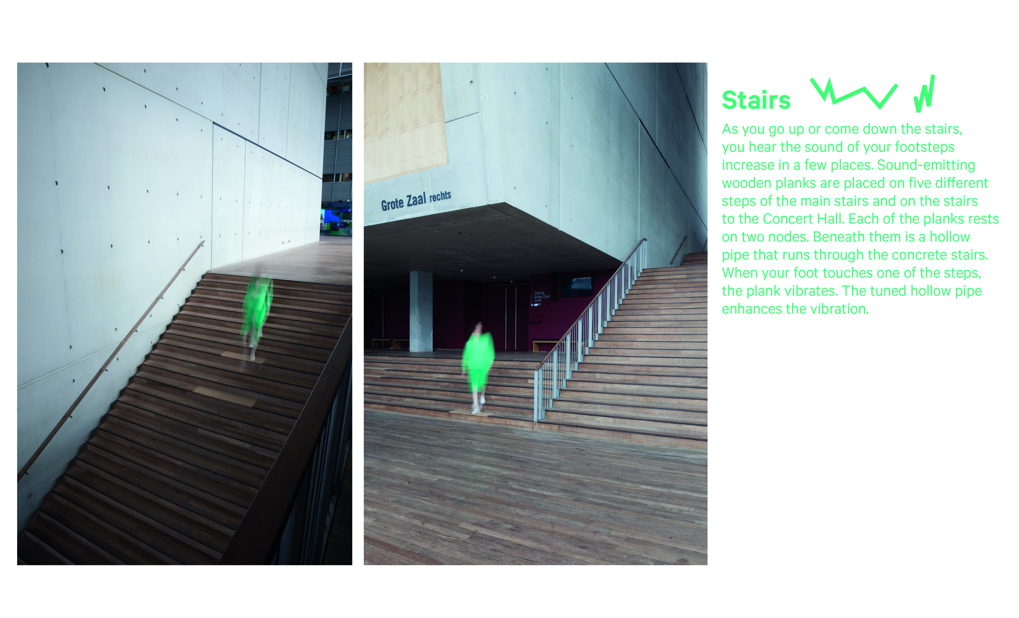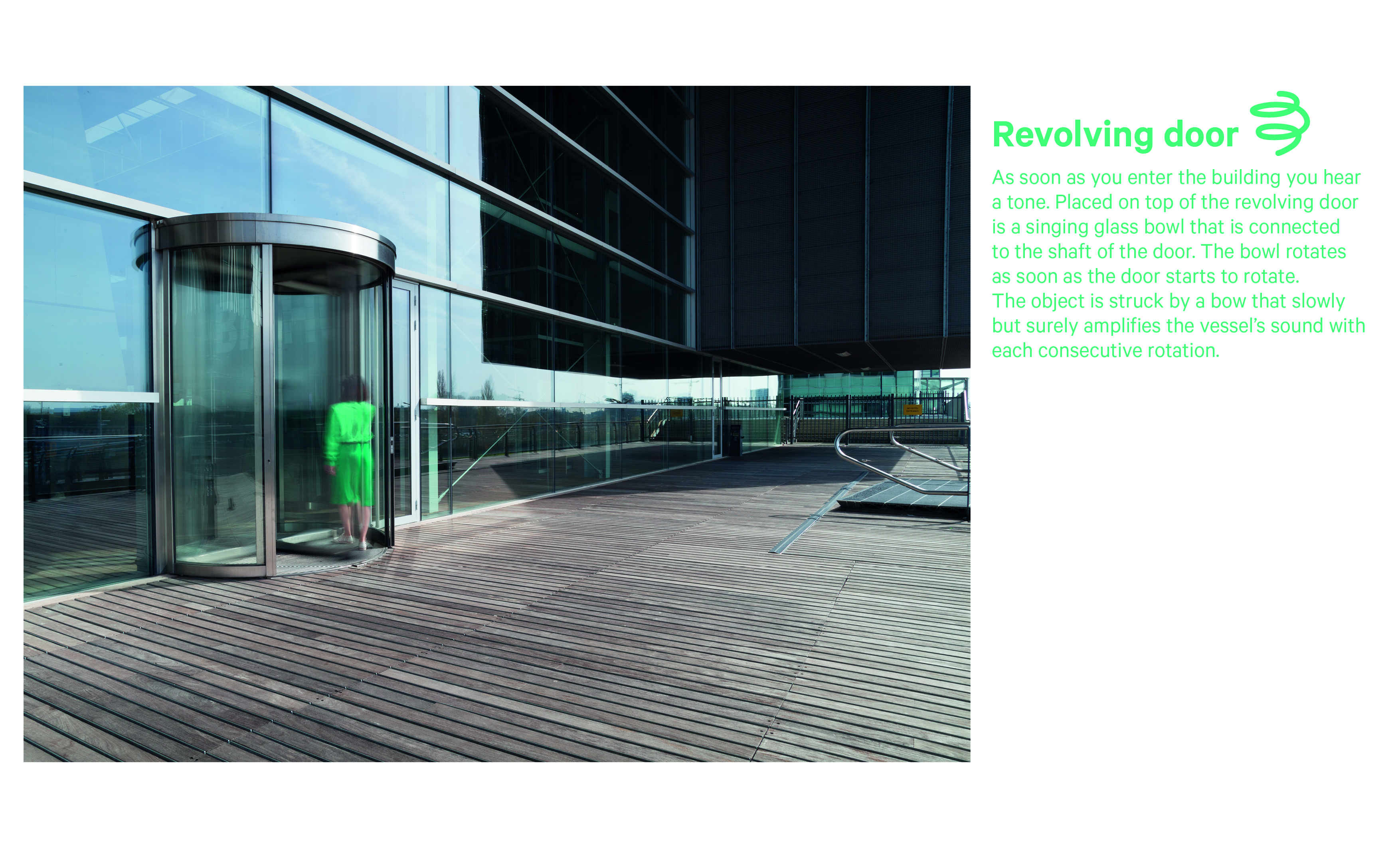 As soon as you realize it, you can’t help but pause for a moment. A whistling bridge, a revolving door that sets off a tone, a handrail that hums as your hand passes over it. Visitors discover 'In Fis' as they move through the building.