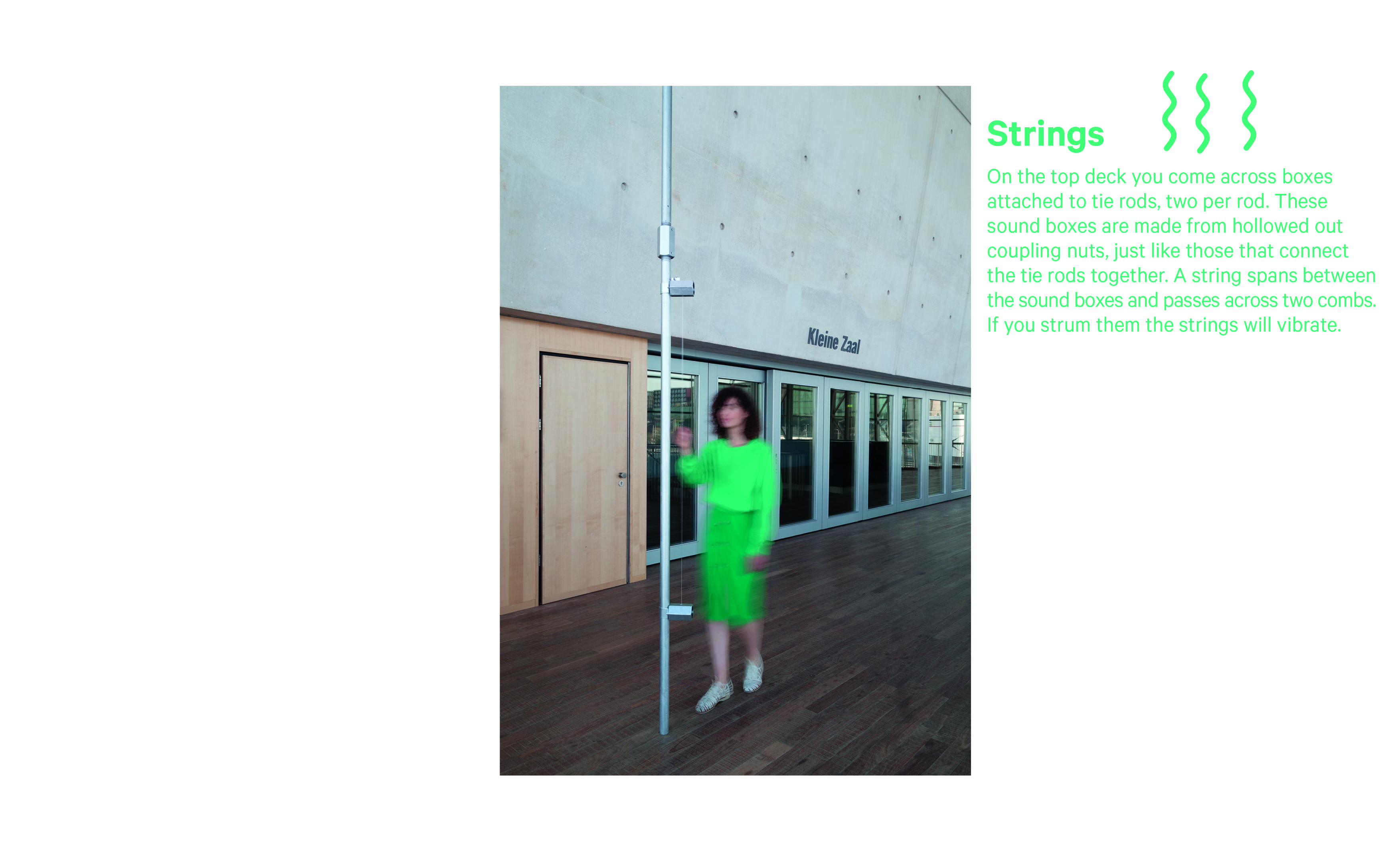 The Muziekgebouw invited artist Paulien Barbas to create an artwork for its public areas. That resulted in five separate interventions in and around the building. During the process, Barbas collaborated with musicians, as well as woodworkers and metalworkers to produce a surprising environment which includes both sonic and architectural elements. By altering and emphasizing small aspects of the environment, she made sounds become perceptible, making us more aware of our surroundings. This all in musical scale F-sharp, for that is the common denominator of the various interventions.